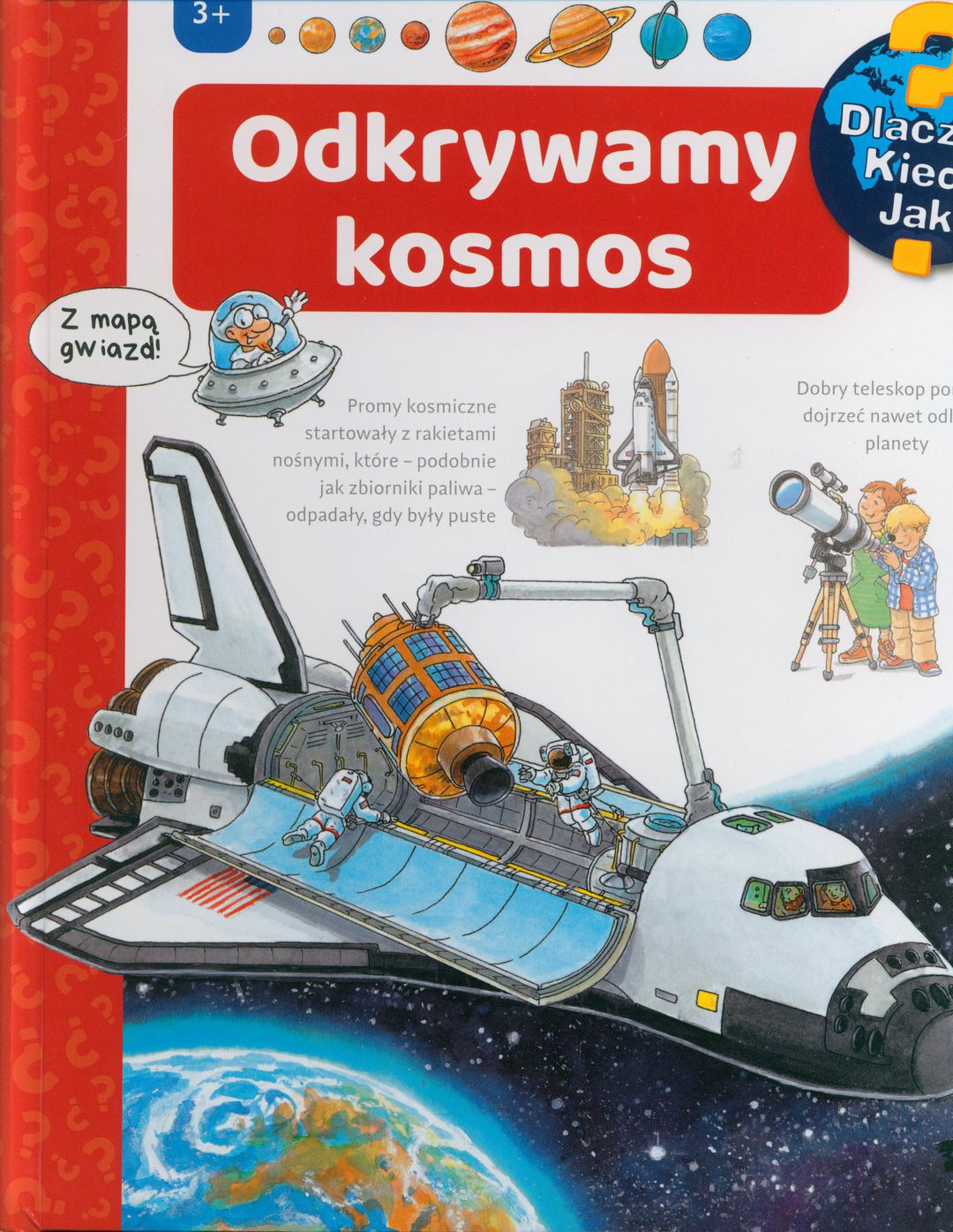 Co to jest kosmos? Jak zostać astronautą? Jak rakieta wzbija się w powietrze? Czy w kosmosie trzeba się myć? Na te i wiele innych pytań, znajdziecie odpowiedzi w książce z okienkami “Odkrywamy kosmos”. Książka należy do popularnonaukowej serii dla dzieci “Dlaczego? Kiedy? Jak?”, która w zrozumiały sposób zaspokaja ciekawość. Wiele okienek i przyjazne ilustracje zachęcają do zadawania pytań i odkrywania kosmosu. Pozycja zaciekawi każdego kilkulatka zafascynowanego tematem kosmosu. Poruszone są tu tematy od planet, przez Słońce, księżyc, gwiazdy, po rakiety, promy i stacje kosmiczne. Dużo ciekawostek opisanych w przystępny dla dzieci sposób, a część z nich ukrytych na odwrocie okienek. [rozowawieza.pl/produkty/ksiazki/odkrywamy-kosmos-ksiazka-z-okienkami/].